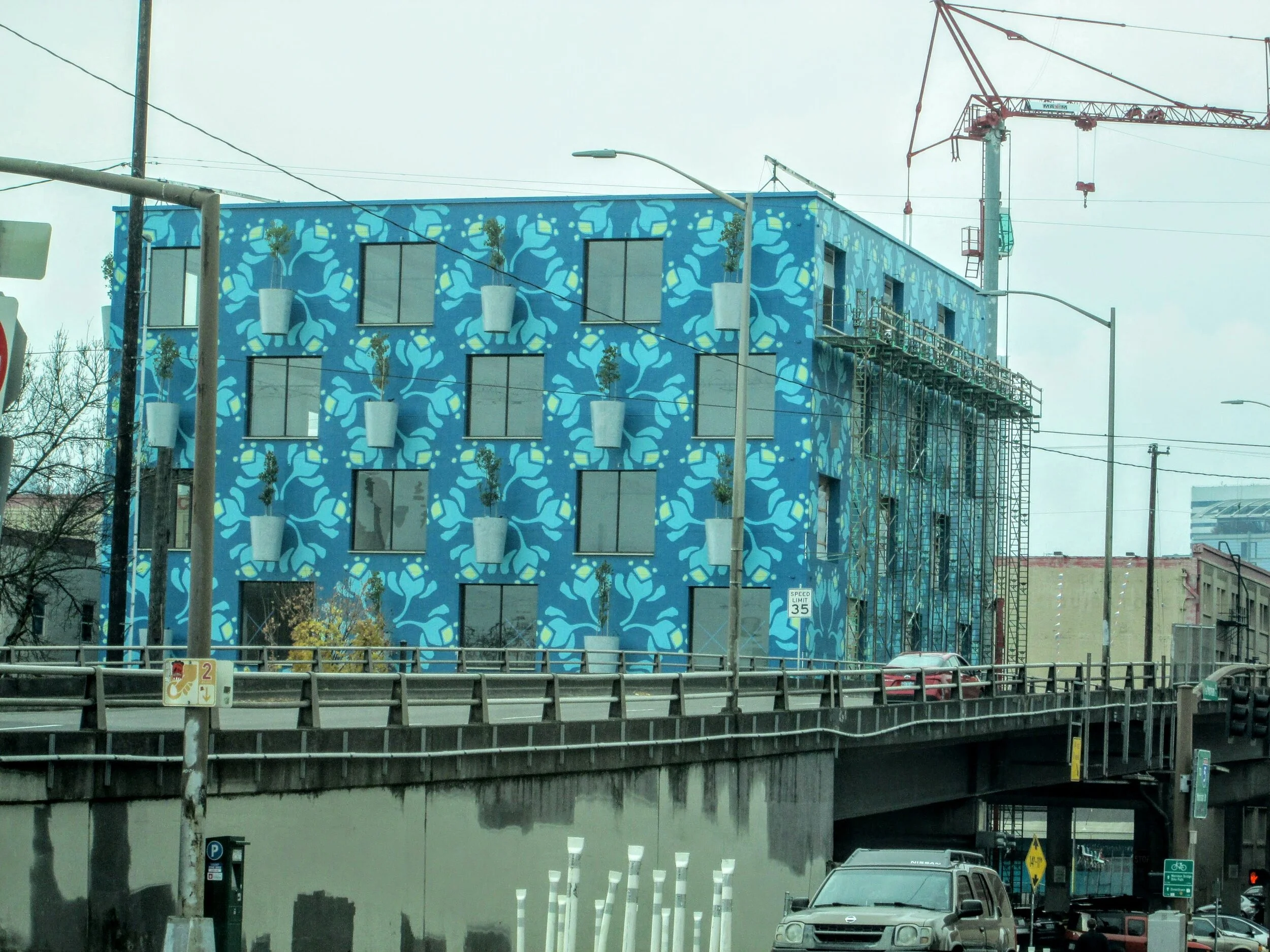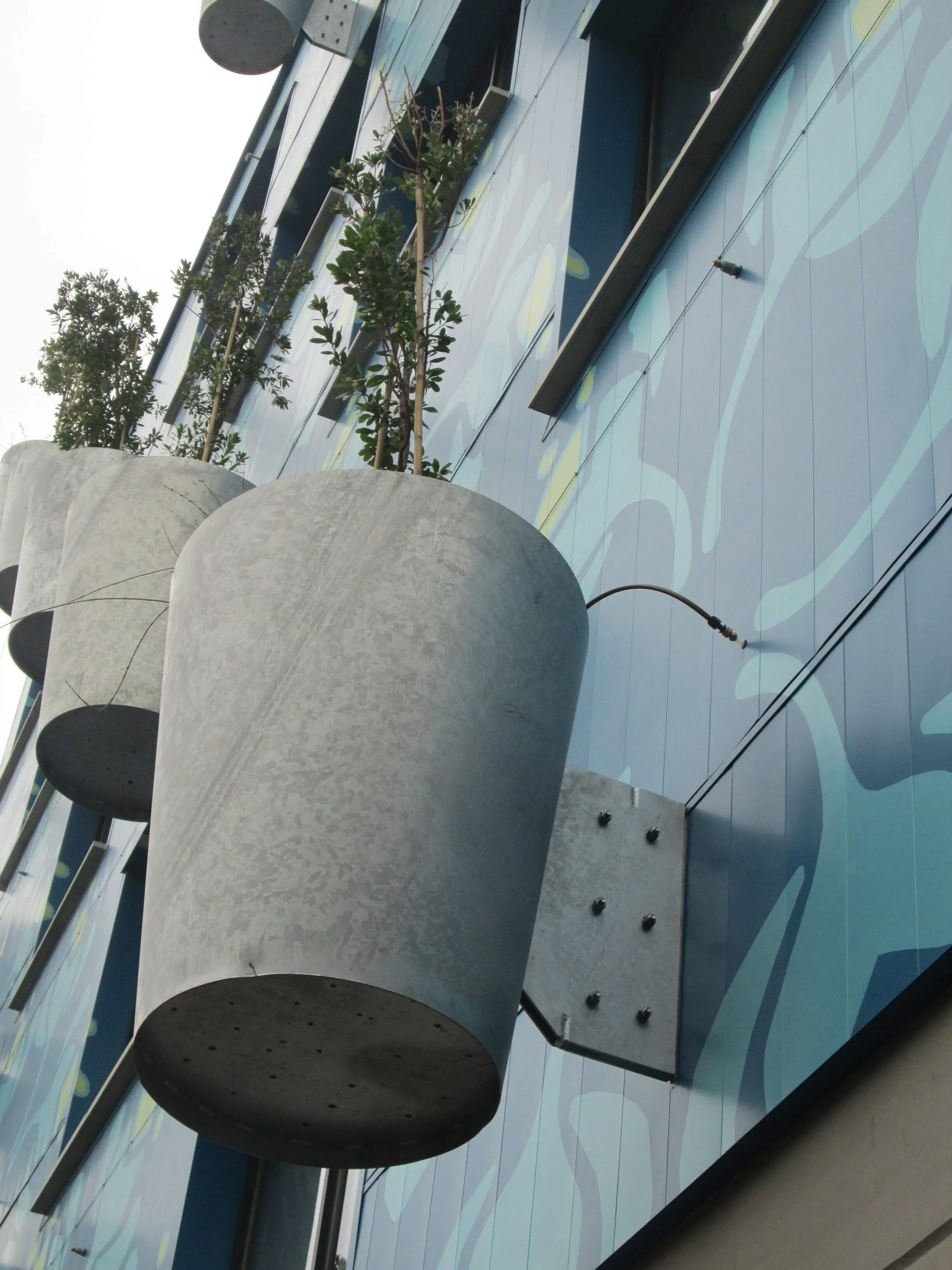 But look skyward from the street and you’ll see something unique for Portland. Secured to the sides of the building are trees housed in cantilevered planters that, from a distance, appear to be floating between the windows. Each pot is five-feet tall and four-feet in diameter at the top, tapering to three-feet at the base. In all, the 56 planter-based trees will likely provide a greater volume of environmental services including passive cooling for the building surface than will the two street-level bay laurels (Laurus nobilis) planned for 3rd Avenue. The Morrison Avenue side to the north is under the bridge, and can’t accommodate street-level trees, says Carr. The tree planters there won’t be used until the third floor, which is above the bridge ramp.