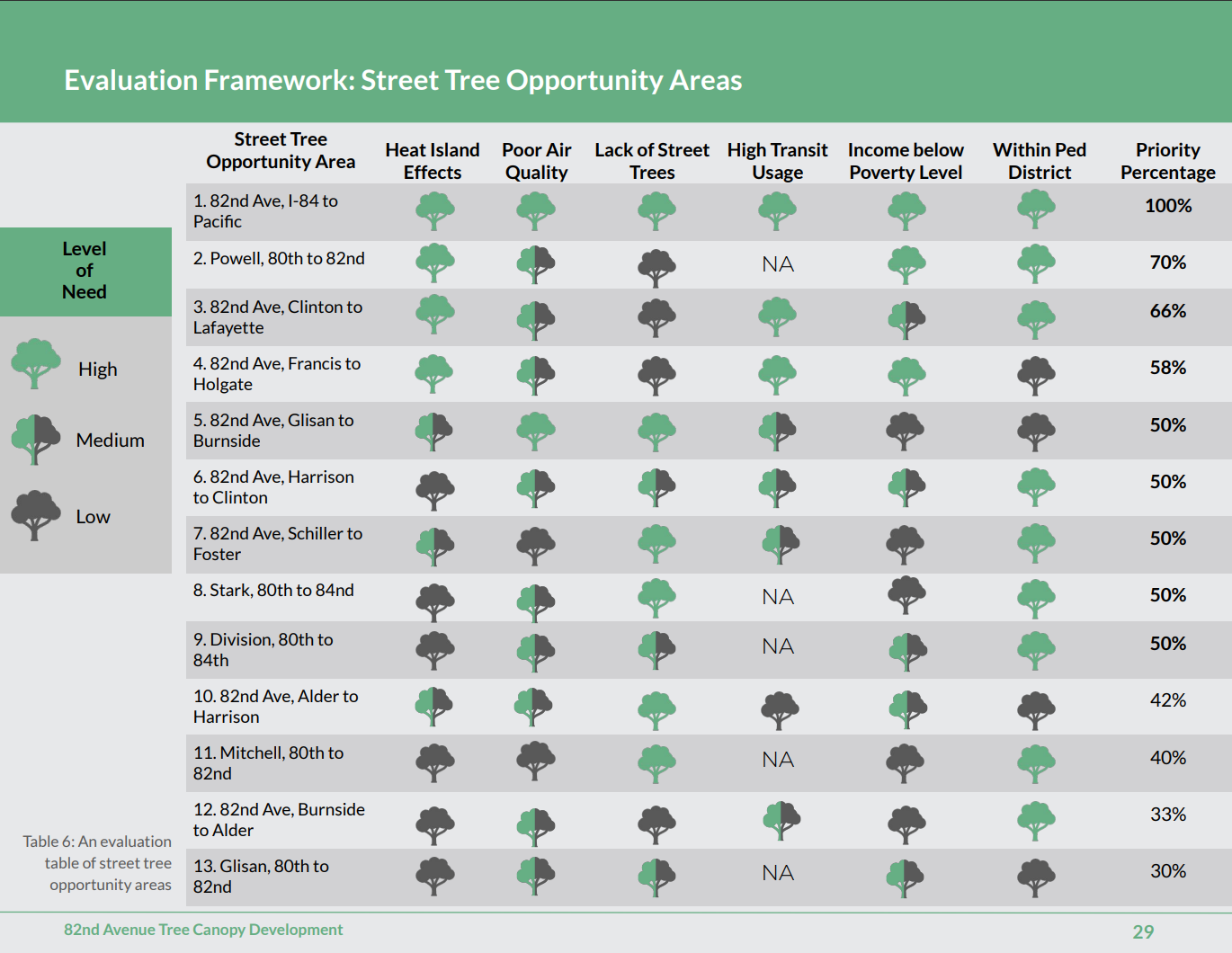 --Priority areas along 82nd that have little canopy and higher midday temperatures include the intersection with I-84; a stretch south of Montavilla; the Jade District; and Eastport Plaza (the map showing this is on p. 18, figure 5, of the report).